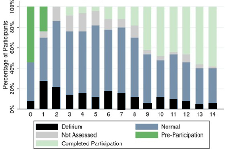 Delirium course was evaluated using descriptive statistics. Daily status (normal, delirium, or not assessed) was visualized for participants on each day post-transplant. Cumulative incidence of developing delirium was visualized. All analyses were performed using Stata 17.0/MP for Windows (College Station, Texas).