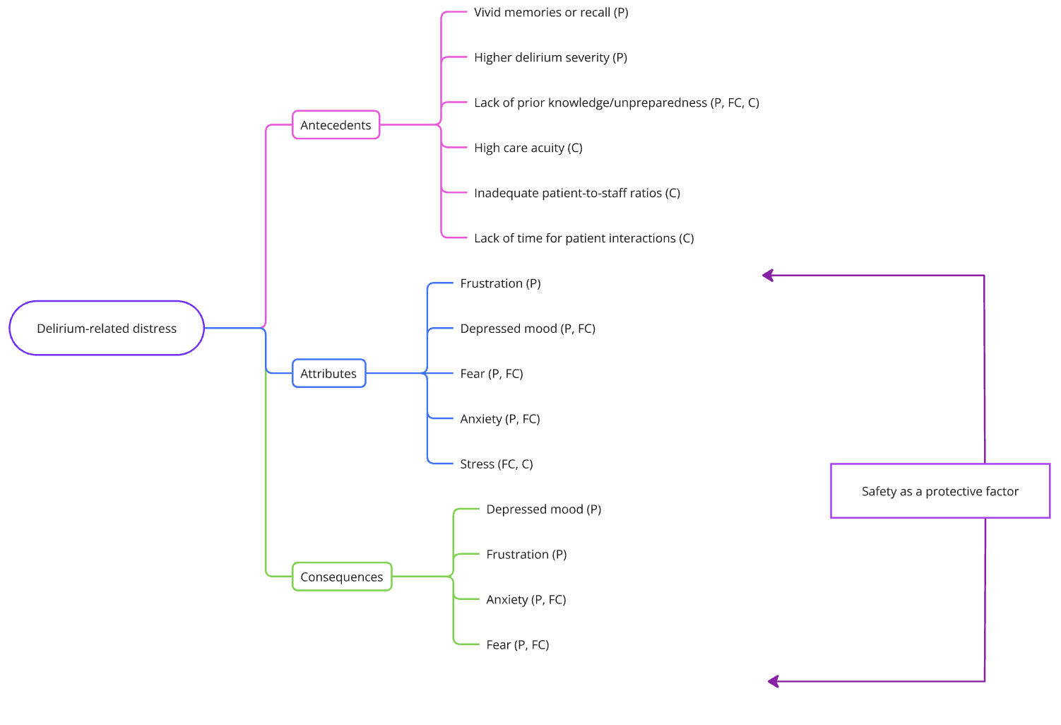 This scoping review and concept analysis is limited by the lack of antecedents and consequences in the literature. Antecedents were most notably lacking for family carers; and consequences for all groups, as the included studies mostly focused on the immediate emotional experience. The literature on protective factors was scarce for all groups. No studies involving children were found. Further work is needed to clarify these gaps. Another limitation is that this review did not examine cultural differences in the experience of delirium-related distress; as it might manifest and be described differently in different cultures,81 this could be a focus of future research. Similarly, we did not quantitively compare differences between patients with delirium who did and did not experience distress. Quantitative observational studies of the protective factors would inform new interventions.