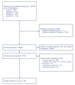 From the 14,243 titles and abstracts screened, 572 had full text review, and 57 articles were included for analysis (Figure 1). Tables 1a, 1b and 1c present the characteristics of included studies, categorised as quantitative (n=23), qualitative (n=27), and mixed methods (n=7) studies. Fourteen studies were published in America,22–35 13 in the United Kingdom,12–14,36–45 seven in Australia,46–52 five in Canada,53–57 four in Japan,58–61 three in Sweden,62–64 and Denmark,65–67 two in China,68,69 Portugal,70,71 and Poland,72,73 and one each in India,74 Taiwan,75 Italy76 and Korea.77